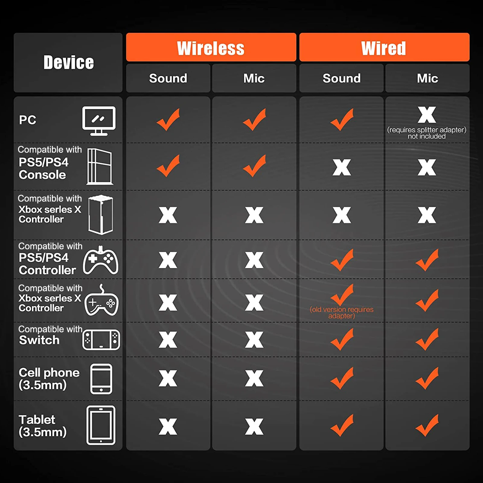 • Wired connection – connects to PS5 controllers, PS4 controllers, Xbox Series X controllers, Xbox One controllers, Switch and mobile devices via 3.5mm cable. Xbox wired adapter for Windows may be required (not included)